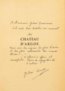 Envoi autographe signé : «A Monsieur Julien Darrieux s'il veut bien habiter un moment Au Château d'Argol, dans une des régions les plus boisées et les plus embrumées du romantisme..., j'ai le plaisir d'offrir cet exemplaire. Avec la sympathie de l'auteur Julien Gracq».