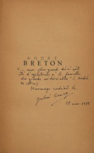 Commentaire de Gracq sous le faux titre : «Mon plus grand désir eût été d'appartenir à la famille des grands indésirables» (André Breton). Hommage cordial de Julien Gracq, 18 mars 1989.»