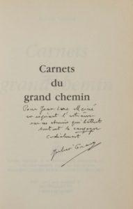 Envoi autographe signé : «Pour Jean-Luc Mercié en espérant l'entraîner sur ces chemins qui battent surtout la campagne, cordialement Julien Gracq».