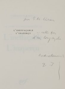 Envoi autographe signé «Pour E.M. Cioran, cette fin d'un long cycle cordialement E.J».