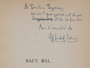 Envoi autographe signé : «A Tristan Tzara, qui sait que poésie est chose des viscères et de la bouche. Avec l'amitié de Michel Leiris».
