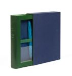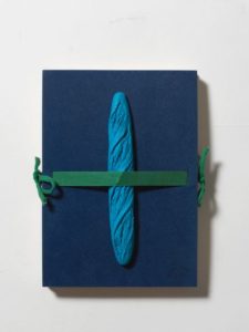 MAN RAY. Le pain peint, 1958. Galerie Iolas, 1958. Grand in-8, plats de carton recouverts de feutrine gris-bleuté, fermant par un ruban de toile verte barrant le milieu de chaque plat et maintenant, en relief, le pain en réduction bleu vif, emboitage demi-maroquin vert sous plexiglas (Françoise Teytaud, Daniel Mercher).