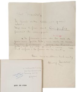 «Voici donc la façon dont Qui je fus pourrait être accompagné : Je formais avec de la mie de pain une petite bête, une sorte de souris. Comme j'achevais à peine sa troisième patte, voilà qu'elle se mit à courir... Elle s'est enfuie à la faveur de la nuit. Avec mes meilleurs sentiments Henry Michaux».