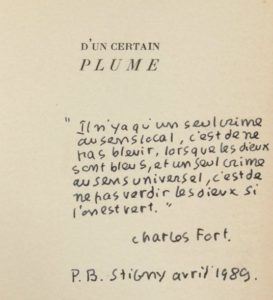 Annotation manuscrite de Bettencourt sur la page de faux titre : «Il n'y a qu'un seul crime au sens local, c'est de ne pas bleuir, lorsque les dieux sont bleus, et un seul crime au sens universel, c'est de ne pas verdir les dieux si l'on est vert, Charles Fort. P.B. Stigny avril 89».