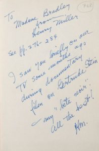 Envoi autographe signé : «to Madame Bradley from Henry Miller, see p 276-284 (1) l saw you briefly on our TV some months ago during documentary film on Gertrude Stein, my “bête noir”(sic) all the best! HM».