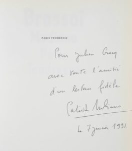 Envoi autographe signé : «Pour Julien Gracq, avec toute l'amitié d'un lecteur fidèle, Patrick Modiano, le 7 janvier 1991».