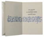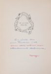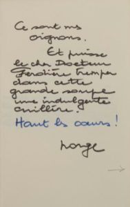 Exemplaire du Docteur Ferdière comportant cet envoi autographe signé en page de garde et sur les deux pages suivantes : «Ce sont mes oignons. Et puisse le cher Docteur Ferdière tremper dans cette grande soupe une indulgente cuillère. Haut les cœurs! Norge». La suite de l'envoi sous forme de quatrain : «ôlis, n'espère pas nous celer plus longtemps/Que cette pureté, cette blancheur auguste/Dont la vierge et les saints font leur sceptre odorant/Ont germé dans le sein d'un oignon noir et fruste».