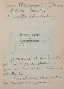 Envoi autographe : «pour Marguerite Duras, fidèle amitié et vieille admiration Angélique passionné et enchanté par les yeux bleus... suis en train de savourer Emily L. les chiens aboient, la caravane passe...».