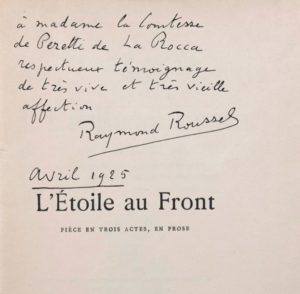 Envoi autographe signé : «à Madame le Comtesse de Peretti de la Rocca, respectueux témoignage de très vive et très vieille affection, Raymond Roussel avril 1925».
