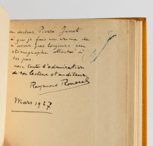 Envoi autographe signé : «Au docteur Pierre Janet à qui je fais un crime de n'avoir pas toujours un sténographe attaché à ses pas. Avec toute l'admiration de son lecteur et auditeur Raymond Roussel, mars 1927».