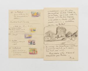 Est jointe une page recto-verso de dessins originaux en couleur rehaussés par Signac formant timbre-poste de tous les tableaux contenus dans la caisse qu'il lui expédie pour son exposition. Théo Van Rysselberghe, peintre belge, proche des idées anarchistes, fut l'ami intime de Signac dont il fit plusieurs portraits.