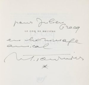 Exemplaire de Julien Gracq portant cet envoi autographe signé : «pour Julien Gracq, en hommage amical, M. Tournier».