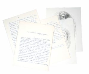TOURNIER Michel. Le Miroir Magique. Manuscrit autographe signé, 7 pages sur arches 30 x 24 cm, accompagné de deux dessins à l'encre signés de Gregory Masurovsky.