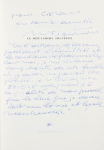 Envoi autographe signé : «Pour Cioran en toute amitié, M. Tournier». Avec cette précision manuscrite de l'écrivain sous le faux titre : «De l'artisan, les écrivains possèdent l'honnêteté et la conscience professionnelle. Pour moi, je me réclame sans honte de cette famille. Si je savais ne pouvoir être publié, je n'écrirais rien. Et il est indispensable à la qualité de mon sommeil que le livre que je donne soit une bonne et loyale marchandise».