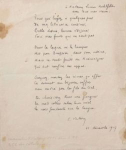 Un poème autographe de Paul Valéry du 31 décembre 1917 dédicacé à Madame Lucien Mühlfed, «la Sorcière».
