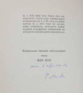 Exemplaire imprimé spécialement pour Man Ray et ajout au stylo à bille sous son nom «avec l'affection de Patrick».