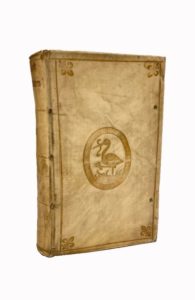 8vo ; mm. 160x120 mm ; magnifique reliure contemporaine en plein vélin avec les armoiries de la famille noble de la Haye. Vélin avec encadrement doré sur les plats et lys de France aux angles, au milieu des plats un grand ovale orné des armoiries de la famille, une cigogne avec un serpent dans le bec. Bon exemplaire.