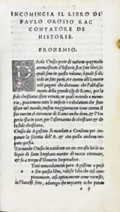 OROSIO. Paulo Orosio tradotto di latino in volgare per Giovanni Guerini da Lanciza. OROSIO, Paolo. Paulo Orosio tradotto di latino in volgare per Giovanni Guerini da Lanciza nuovamente stampato.Toscolano, Paganino e Alessandro Paganini, s.d. (1527-1533 ca.)