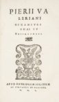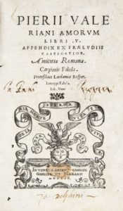 Première édition. Les cinq livres Amoureux, écrits en vers élégiaques, ont été composés en 1524 et sont restés longtemps inédits. Le sixième livre, en revanche, rassemble quatre opéras juvéniles déjà présents à Venise en 1509 sous le titre de Praeludia. Toutes les compositions poétiques, en rapport avec le grand style et les nombreuses nouvelles contenues, sont consacrées à certains des protagonistes de la vie intellectuelle de l'époque : Isabella Gonzaga, Bembo, Beroaldo, Fracastoro, Sabellico, Sannazaro. Pietro Valeriano, 1477-1558, humaniste de Belluno né Giovanni Pietro Bolzani De Fosse, était le neveu de l'illustre Grec Urbano Dalle Fosse, qui en 1493 l'introduisit dans le cercle d'Aldo Manuzio à Venise. Il y eut des maîtres Valla, Lascaris et Sabellico, qui lui suggérèrent d'adopter le nom de Piero Valeriano. En 1509, il s'installe à Rome, où il devient le mécène du pape Léon X, qui lui confie l'éducation de ses neveux, Ippolito et Alessandro. En 1537, après la mort de Clément VII et d'Ippolito et Alessandro de Médicis, il se retire à Belluno pour une longue période.