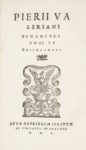 Legato con : VALERIANO, Piero. Hexametri odae et epigrammata.Venezia, G. Giolito Di Ferrarii, 1550.Prima Edizione, dedicata a Caterina de' Medici, della più completa raccolta di componimenti neolatini del Valeriano apparsa durante la sua vita. Chaque section de l'ouvrage débute par une brève introduction du tipographe Gabriele Giolito qui confirme la participation active de l'auteur à la direction éditoriale de la collection : "Quae quidem opuscula Pierius iuvenis admodum ediderat, mox diligentius recognoverat, putavi ea non abiicienda atque, ita ut recognita erant, aliis adiungi iussi". Le volume commence par un long composant géographique, De milacis cultura, dédié à Alessandro de Médicis, qui traite de la découverte de la smilace indienne. Dans différentes versions, il commémore ensuite les amis et les collègues connus à Venise, Rome et Padoue : notamment les membres de la famille Médicis, son professeur à Belluno Giosippo Faustino, le poète latin Pietro Corsi, le noble protecteur romain des humanistes Pietro Mellini, le célèbre humaniste vénitien Ermolao Barbaro, le poète Andrea Marone ; Andrea Gritti ; l'umaniste véronais Dante le Terzo Alighieri ; Alberto Pio di Carpi ; Giovanni Francesco et Giovanni Battista della Rovere ; le cardinal Bernardo Dovizi da Bibiena ; l'umaniste vénitien Marcantonio Sabellico ; le cardinal Girolamo Aleandro et d'autres encore.