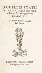 Greek literature. STAZIO. De Clitophontis et Leucippes Amoris Libri VIIII. STAZIO, Achille. De Clitophontis et Leucippes Amoris Libri VIIII. Basileae, Heruagium, 1554