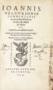 Rara prima edizione lionese, pubblicata da Sebastien Gryphe, di questi commentari alla fisica aristotelica del Velcurius. Ai commentari segue la dissertation De animae principatu di Jacobus Schegkius di interesse soprattutto medico. Il testo di Velcurius segue gli stilemi dei commentari scolastici alla fisica aristotelica sviluppando tuttavia in modo ampio gli argomenti dedicati alla botanica e alla medicina.