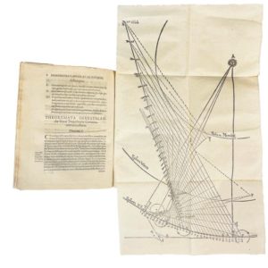 3 parties dans un volume in-4to. 202x152 mm. Legatura coeva in pergamena floscia. Pagine [8], 98, [6], 99-110, [5], 110-138, [2 bianche]. Segn : *⁴A-T⁴. Illustrazioni xilografiche di diagrammi su tutto il testo. 5 tavole su doppia pagina o ripiegate : 2 Tavole incise con proiezioni, 3 Tabelle a stampa. Le deuxième et le troisième livre commencent avec leur propre frontispice, le dernier étant daté de 1620. Lieve ingiallitura omogenea nelle prime pagine, lieve foxing, buon esemplare.