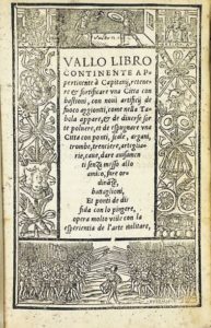 Art of War. VALLE. Vallo Libro continente appartinente à Capitanij, retenere & fortificare una Città... VALLE, Giovanni Battista. Vallo Libro continente appartinente à Capitanij, retenere & fortificare una Città con bastioni, con novi artificij de fuoco aggionti come nella Tabola appare, & de diverse sorte polvere, & de espugnare una Città con ponti, scale, argani... [In fine :] Venezia, eredi di Pietro Ravano e Compagni, 1543