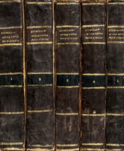 5 voll. in folio, 350x230 mm, legatura in mezza pelle e pergamena. Titoli e fregi in oro al dorso. Testo su due colonne. Diffuse fioriture e bruniture per la qualità della carta. Manca la tavola incisa da Carlo Pascale.