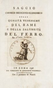 Mineralogy. CORONA. Saggio chimico medico ed economico delle qualità venefiche del rame e della salubrità del ferro. CORONA, Nicola. Saggio chimico medico ed economico delle qualità venefiche del rame e della salubrità del ferro. Rome, G. Puccinelli, 1796