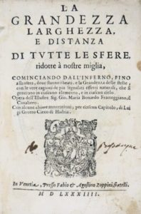Cosmology. BONARDO. La Grandezza, Larghezza e Distanza di tutte le Sfere. 1584 BONARDO, Giovanni Maria. La Grandezza, Larghezza e Distanza di tutte le Sfere, ridotte a nostre miglia. ... Con alcune chiare annotationi ... di Luigi Grotto Cieco di Hadria.Venezia, Fabio e Augusto Zoppini, 1584