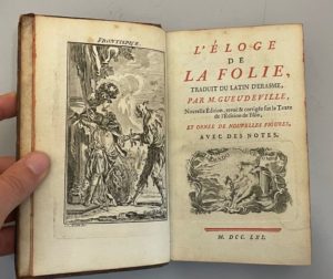 ERASMUS. L'éloge de la folie. 1761 ERASME. L'éloge de la folie, traduit du latin d'Erasme, par M. Gueudeville, Nouvelle édition, revuë & corrigée sur le texte de l'édition de Bâle, et ornée de nouvelles figures, avec des notes. Sl, sn, 1761.