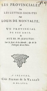 PASCAL. Les Provinciales ou les lettres escrites par Louis de Montalte. PASCAL, Blaise. Les Provinciales ou les lettres écrites par Louis de Montalte, à un Provincial de ses amis, & aux RR. PP. Jésuites : sur le Sujet de la Morale, & de la Politique de ces Pères. Cologne, de la Vallée [Elzevier], 1657