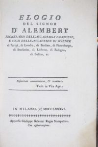 Mathematics. FRISI. Elogio del Signor D'Alembert. FRISI, Paolo. Elogio del Signor D'Alembert Secretario dell'Accademia Francese... Milano, Galeazzi, 1786.