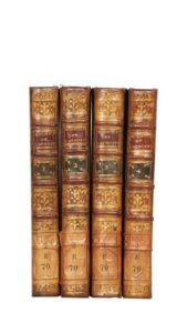 4 voll. in-8vo piccolo, mm. 190 x 130. Leg. piena pelle coeva, dorso a 5 nervi con fregi in oro e tasselli per i titoli. Pp. XVI, 296, 2 f.c. ripieg. ; pp. VII, (1), 336, 1 f.c. ripieg. ; pp. VIII, 334, 4 f.c. ripieg. ; pp. VII, (1), 367, (1), 1 f.c. ripieg., con 8 tavv. in rame ripiegate f.t. (num. I-VI + l non numerata) e una tabella numerica a stampa. Étiquettes rosées. Test. et final. Timbri di biblioteca estinta ai frontespizi e qualche brunitura, ma buon esemplare.
