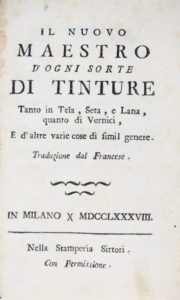 Colors - Chemistry. Il Nuovo Maestro d’ogni sorte di Tinture tanto in Tela, Seta, e Lana, quanto di Vernici, e d’altre varie cose di simil genere. ANONIMO. Il Nuovo Maestro d'ogni sorte di Tinture tanto in Tela, Seta, e Lana, quanto di Vernici, e d'altre varie cose di similare genere.Milano, Sirtori, 1788