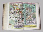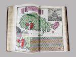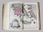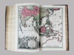 Grand Folio, 540x340 mm. Reliure d'époque en plein cuir avec titre sur le dos. Frontispice allégorique colorié à la main à l'époque, page de titre en rouge et noir, dédicace à l'empereur Charles VI, 2 feuilles de texte, index des cartes en vente chez Seutter, autre dédicace à Charles VI gravée sur cuivre sur double page, en couleur originale. Suivi de 117 planches gravées sur cuivre sur une double page : 110 cartes géographiques et 7 planches avec différentes représentations relatives à la géographie, toutes en brillante coloration coeval, sauf la dernière. L'atlas est généralement en bel état et brillamment coloré, avec de petits défauts : deux restaurations à la page de titre, cartes contemporaines numérotées et décrites au verso à l'encre et dans le coin supérieur droit au crayon. Quelques taches par endroits, principalement dans les marges. Traces d'usure à la reliure, bon exemplaire.