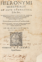 1587. — LIBRO : — (GIMNASIA).— MERCURIALIS, HIERONYMI : — DE ARTE GYMNASTICA Libri Sex.— Venetiis : Apud Iuntas, 1587. 8º mayor. Portada + 6 h. + 308 p.+ 13 h. Grabado calcográfico en la portada. Ilustr. con xilografías en el texto.