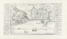1725 ca.— GRABADO : — (BARCELONA).— STRIDBECK, IOH.; [BODENEHR, GABRIEL] : — BARCELONA. Plano de la ciudad de Barcelona con una columna de texto a cada lado de la imagen. 15 x 27,5 cm huella, 19 x 32 cm papel. Cat. Solery 162A .