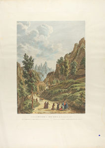– MOULINIER y L. GARREAU : ENTRADA DEL MONASTERIO DE MONT-SERRAT, POR EL CAMINO DE COCHES. 46,5 x 34,5 huella, 59,5 x 42,5 cm papel. Coloreado. Todos ellos para la obra de Laborde ´Voyage pittoresque et Historique de l`Espagne...´. Algún punto de óxido.