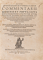 1594. — LIBRO : — (HISTORIA-CLÁSICA).— RERUM AUGUSTANARUM VINDELICARUM COMMENTARII, NOMINIS ET POPULI EIUS ORIGINEM, URBIS AUGUSTAE SITUM, INSIGNIUM EIUSDEM EXPLICATIONEM...— Francofurti ad Moenum : Ac typis Egenolphianis, 1594. 4º menor. 4...