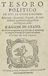 1602. — LIBRO : — (POLÍTICA).— TESORO POLITICO IN CUI SI CONTENGONO RELATIONI, INSTRUTTIONI, TRATTATI, & VARII DISCORSI, PERTINENTI ALLA PERFETTA INTELLIGENZA DELLA RAGION DI STATO.— Vicenza : Giorgio Greco, 1602. 8º menor. 6 h. + 430 fol....