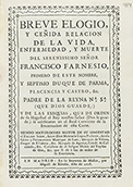 1728. — LIBRO : — (EXEQUIAS).— LOPEZ PACHECO, MERCURIO : — BREVE ELOGIO Y CEÑIDA RELACION DE LA VIDA, ENFERMEDAD Y MUERTE DEL SERENISSIMO SEÑOR FRANCISCO FARNESIO, PRIMERO DE ESTE NOMBRE, Y SEPTIMO DUQUE DE PARMA, PLACENCIA Y CASTRO, &....