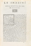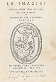 1556.— LIBRO : — (MITOLOGÍA).— CARTARI, VINCENZO : — LE IMAGINI CON LA SPOSITIONE DE I DEI DE GLIANTICHI.— Venetia : Francesco Marcolini, 1556. 8º mayor. 4 fol. + CXXII fol. (a partir del XIII numerados en romana).