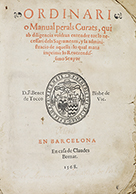 1568. — LIBRO : — (MISA).— ORDINARI O MANUAL PERALS CURATS, QUI AB DILIGENCIA VOLDRAN ENTENDRE TOT LO NECESSARI DELS SAGRAMENTS, Y LA ADMINISTRACIO DE AQUELLS : LO QUAL MANA IMPRIMIR LO REVERENDISSIMO SENYOR D. F. BENET DE TOCCO.— Barcelona....