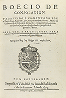 1604. — LIBRO : — (FILOSOFÍA).— BOECIO : — DE CONSOLACIÓN. Traduzido y comentado por el Padre Fray Augustin Lopez...— Valladolid : Imp. por Juan de Bostillo, 1604. 4º. 14 h. + 362 p. + 16 h. Portada con escudo real xilográfico.