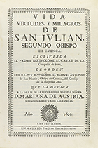 1692. — LIBRO : — (HAGIOGRAFÍA).— ALCAZAR, BARTHOLOME : — VIDA VIRTUDES, Y MILAGROS, DE SAN JULIAN, SEGUNDO OBISPO DE CUENCA.— Madrid : Juan Garcia Infanzon, 1692. Folio menor. 22 h. + 481 p. + 10 h.