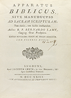 1723. — LIBRO : — (RELIGIÓN).— LAMY, BERNARDO : — APPARATUS BIBLICUS SIVE MANUDUCTIO AD SACRAM SCRIPTURAM.— Lugduni : apud Jacobum Certe, 1723. 4º. 10 h. + 422 p. + 31 h. + 23 lám. calcográficas. Portada con marca xilográfica. Ilustr....