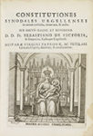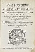 1748. — LIBRO : — (HUMANIDADES).— CONSTITUTIONES SYNODALES DIOECESIS URGELLENSIS AB ILLUSTRISSIMO, ET REVERENDISSIMO D. D. Fr. SEBASTIANO DE VICTORIA...— Barcin[ona] : Ex Officina Joannis Piferrer, 1748. 8º mayor. 38 h. + 456 p.