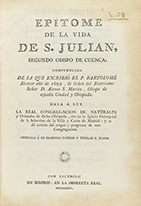 1785. — LIBRO : — (HAGIOGRAFÍA).— ALCAZAR, BARTOLOMÉ : — EPÍTOME DE LA VIDA DE S. JULIAN, SEGUNDO OBISPO DE CUENCA : COMPENDIADA DE LA QUE ESCRIBIÓ...— Madrid : Imp. Real, 1785. 8º mayor. 8 h. + grabado de Matheo González grabado por...